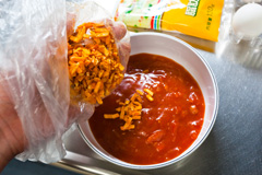 いい感じに砕けたら、それをナポリタンソースに入れます。