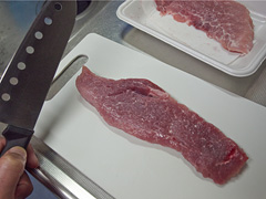 買ってきた豚肉に軽く切り目を入れ、包丁の背中で少し叩きます。